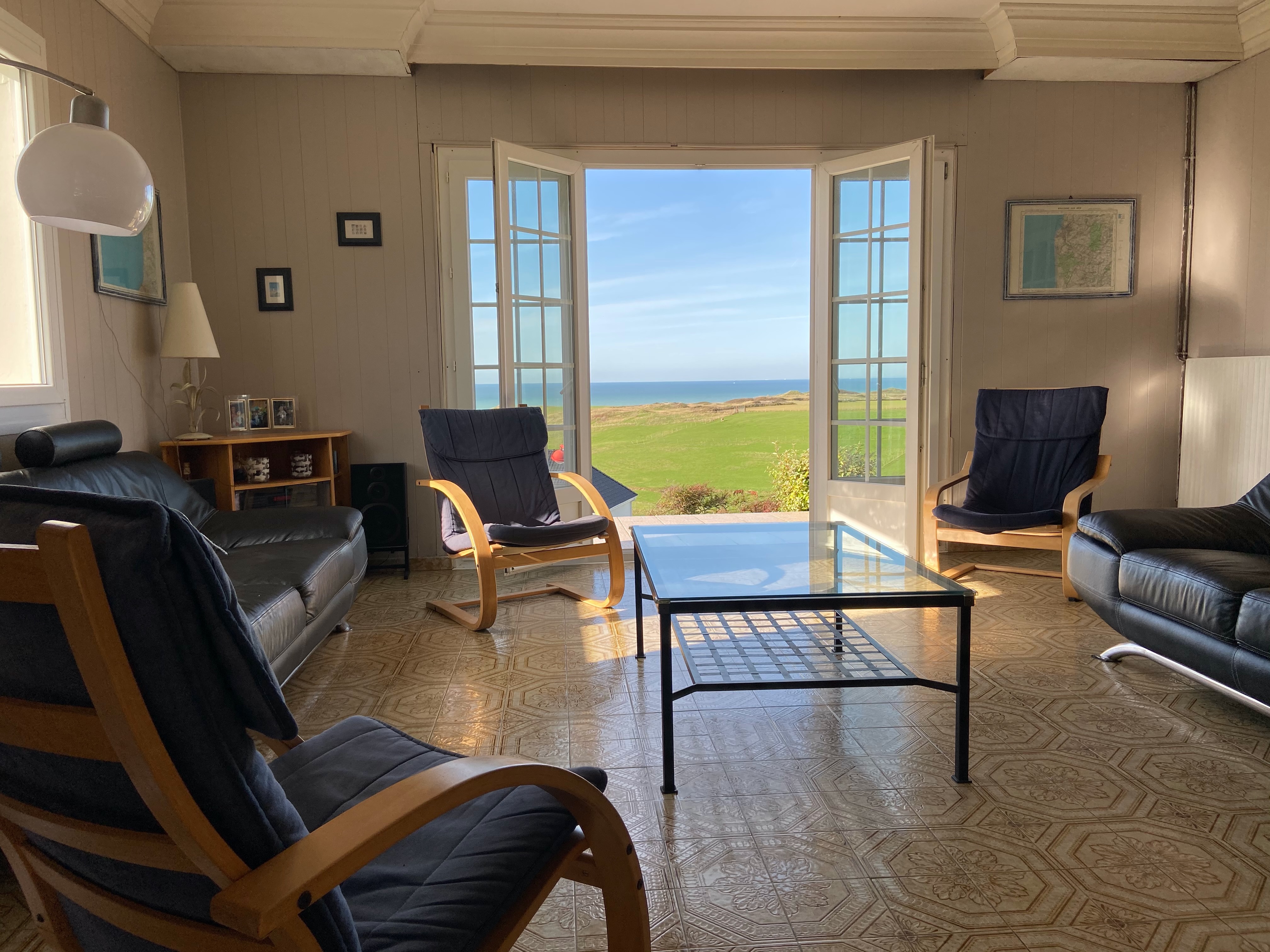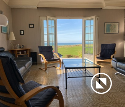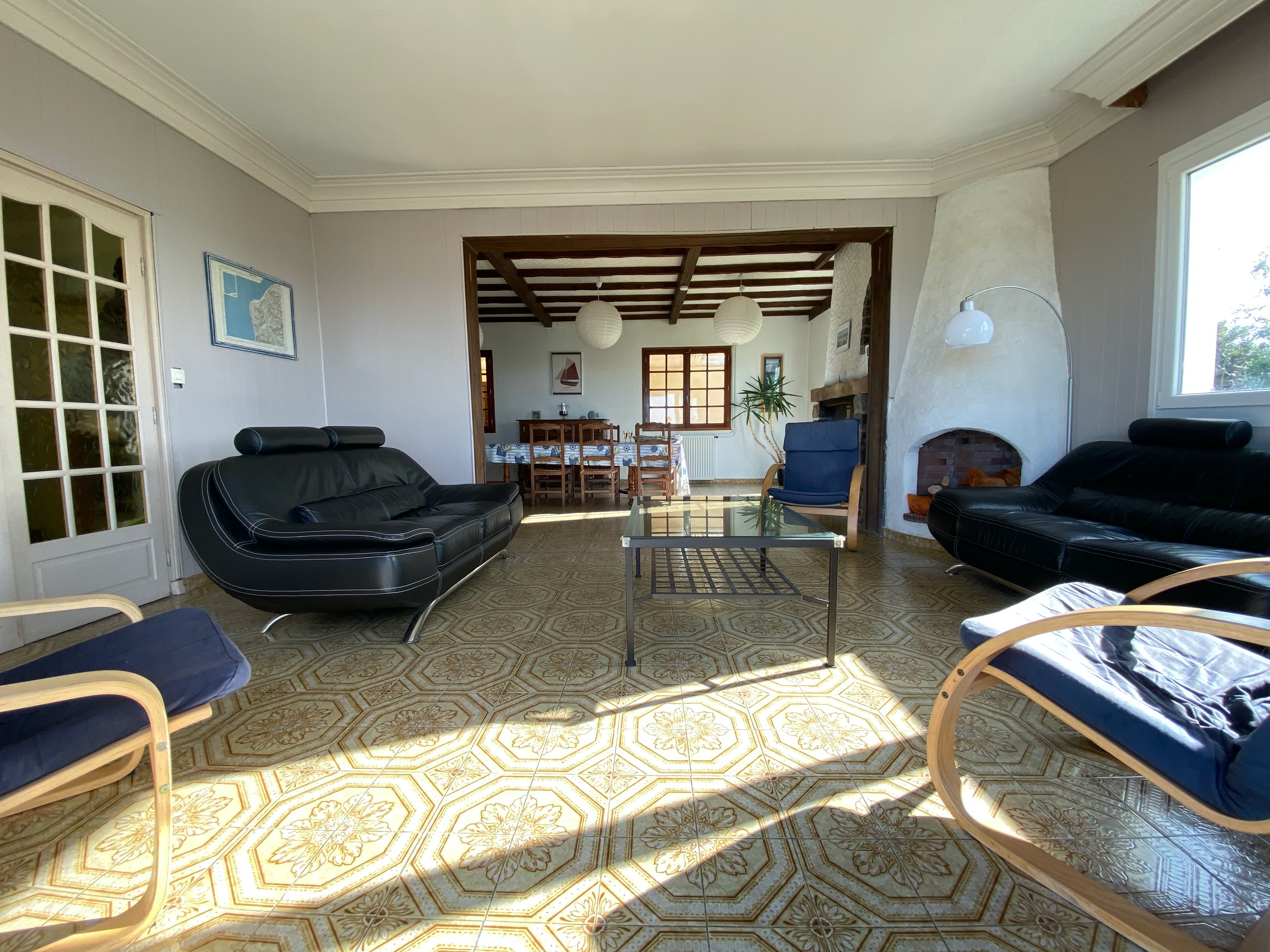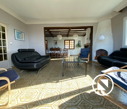 En entrant dans la maison, un large couloir donne immédiatement accès au salon où 2 grands canapés et quelques fauteuils vous permettront de profiter de la vue mer.