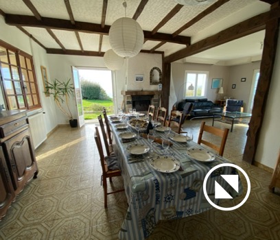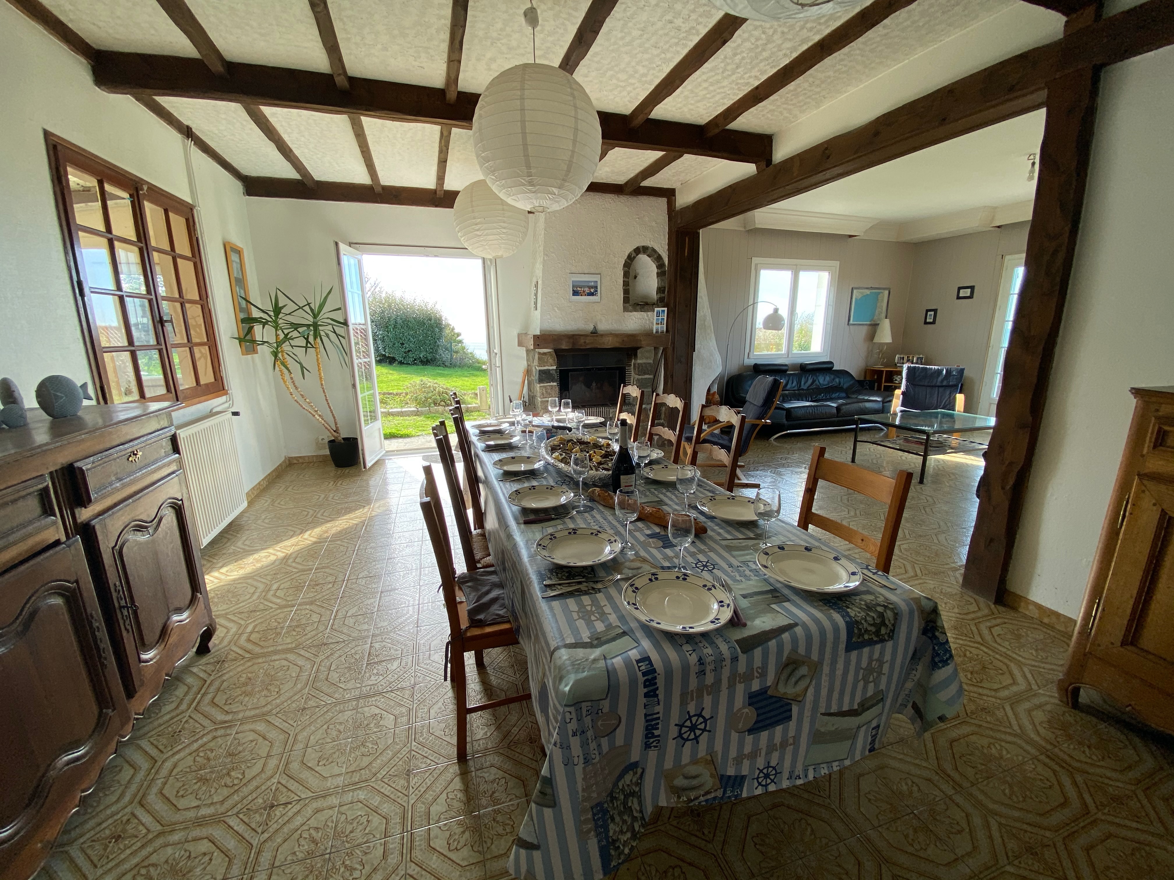 Dans son prolongement, la partie séjour avec à son centre une grande table pouvant accueillir jusqu’à 16 personnes (avec rallonges) vous donnera accès à la cuisine et son arrière cuisine disposant de tout le nécessaire (four, plaques induction, hotte, micro-onde, cafetière, bouilloire, lave vaisselle, réfrigérateur et congélateur,...).